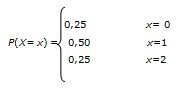 Seja X o número de caras que podem ocorrer quando se joga uma moeda duas vezes. Veja o diagrama de árvore e a função de probabilidade por abaixo.